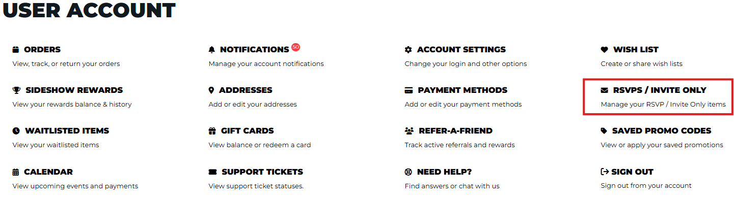 Click the Account Icon on either the mobile or desktop version of our website and proceed to login or create an account. After you have successfully logged in, click the icon again to activate the account menu. Choose 'RSVPs/Invite Only.'